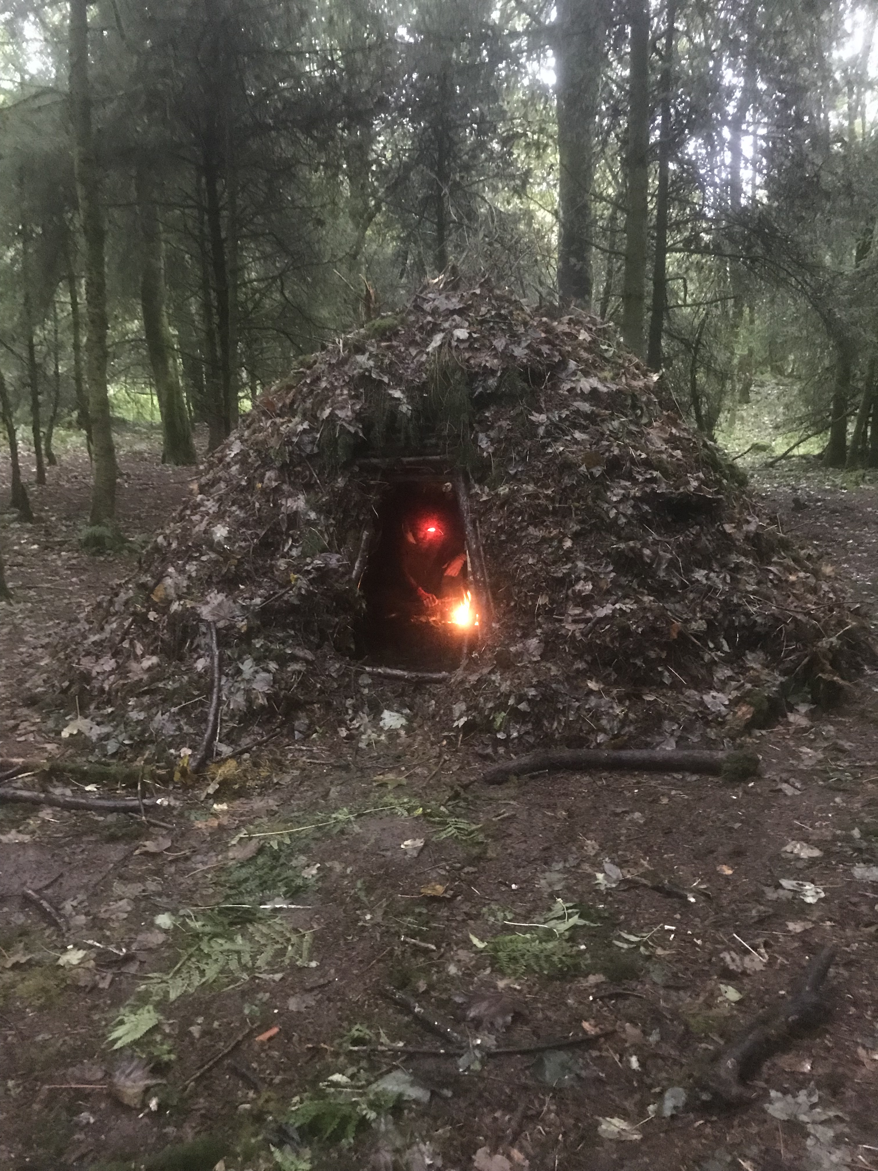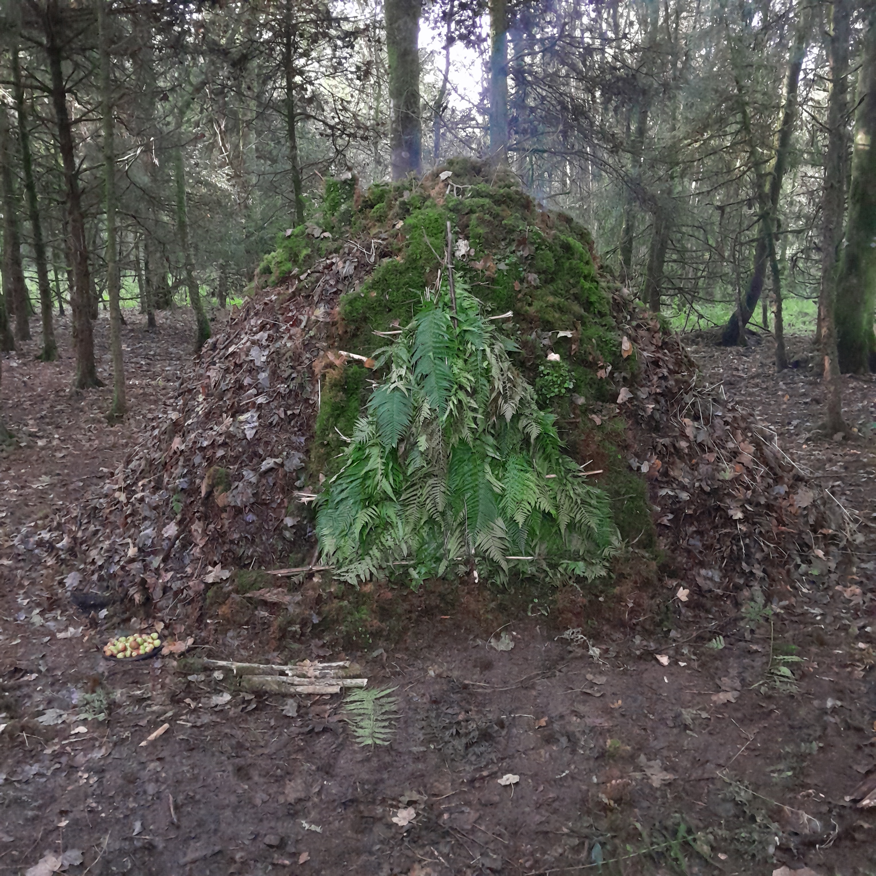 Une cabane directement faite de la forêt : les arbres qui offrent la structure et le squelette ; la litière du sol qui offre la couverture ; les branches d’épicéa et les fougères qui offrent les lits.