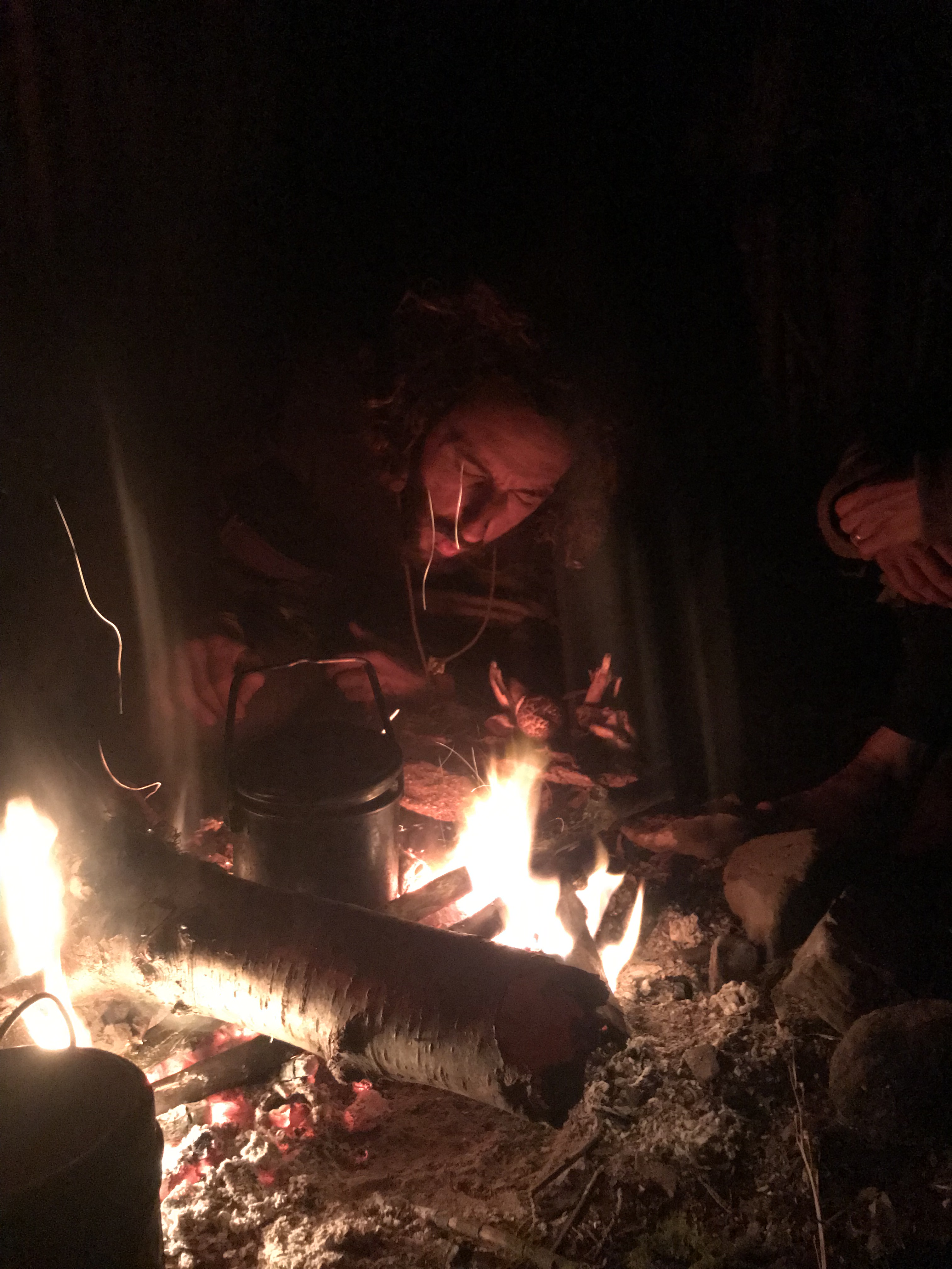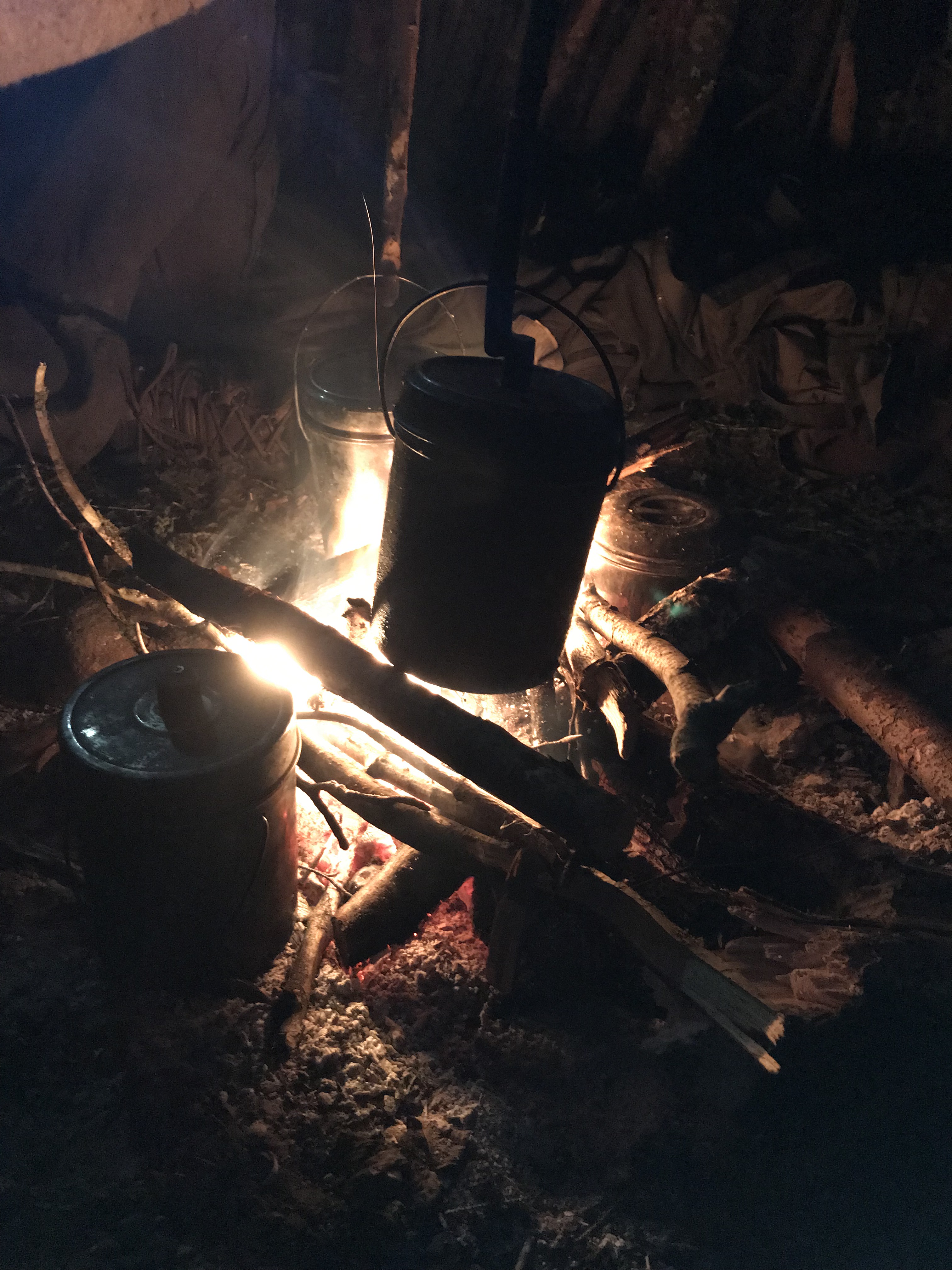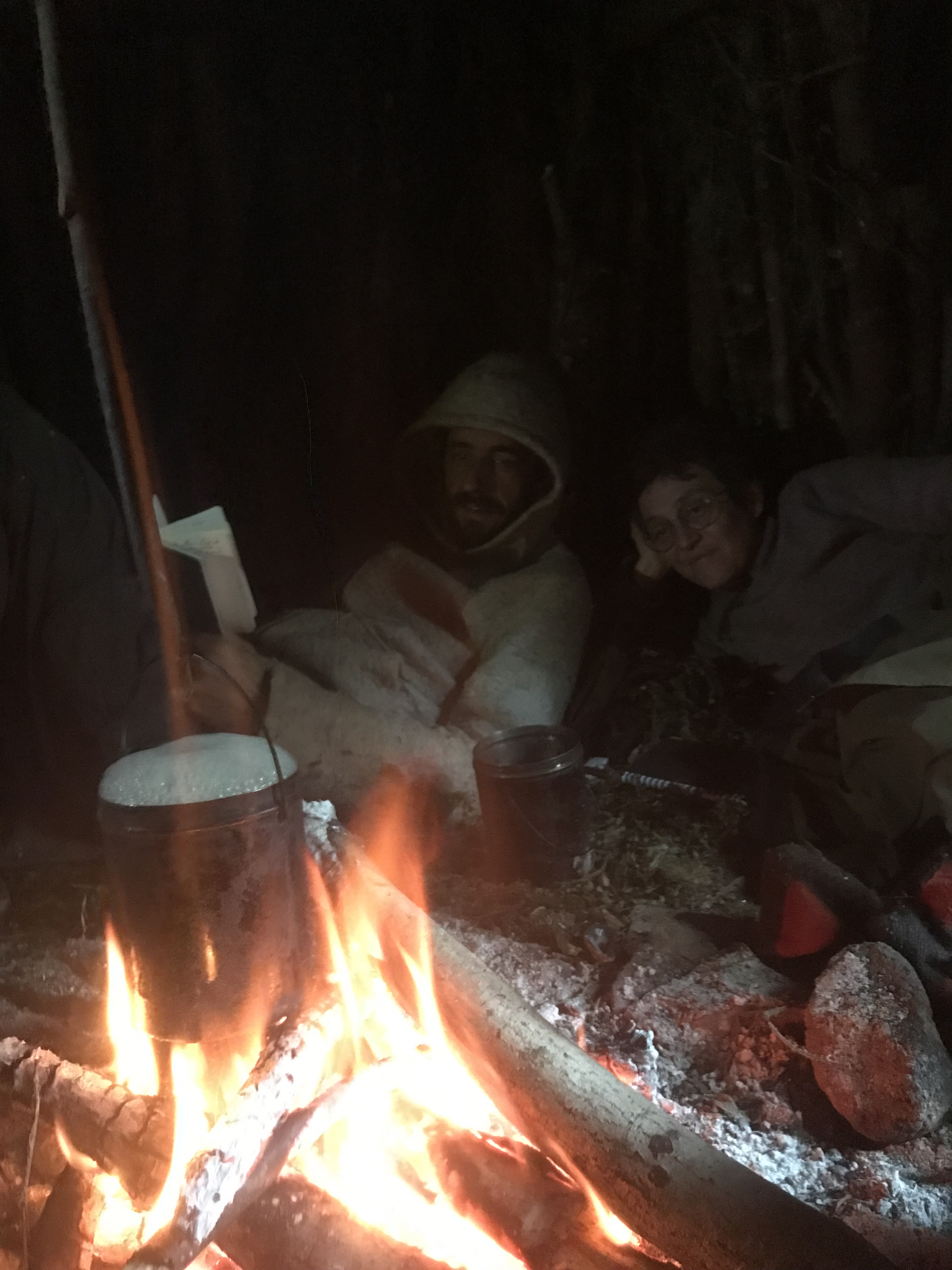 Je transportais ces sensations lors du premier jour, intense, excessivement pluvieux, et qui nécessitait que l’on fasse une cabane pour nous 4 centrée sur un feu qui nous permettrait de boire en sécurité.