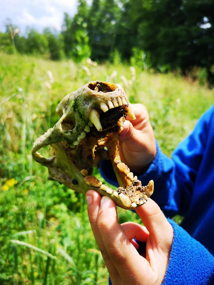 Après avoir joué, la forêt, à nouveau, nous a offert ces cadeaux. Alors que les enfants étaient partis seuls, explorer, et que nous, les parents, nous nous apprêtions à aller veiller sur eux, très discrètement, ils sont revenus au camp à toute vitesse avec un crâne de blaireau intact !