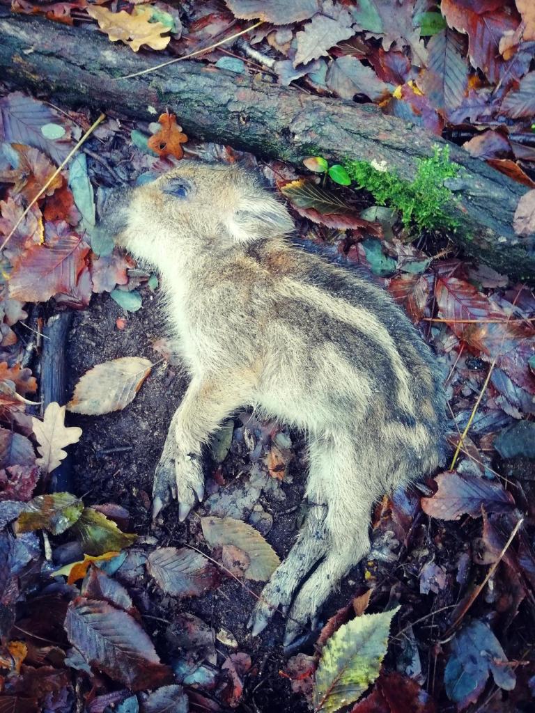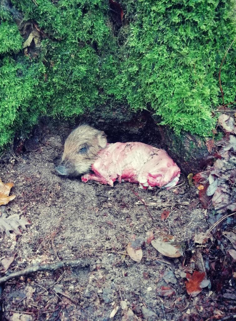 Alors que nous approchions de la blaireautière où j’aime emmener des groupes et faire des affûts, et que je demandais à Eloïse d’approcher avec révérence, nous avons trouvé un marcassin mort.