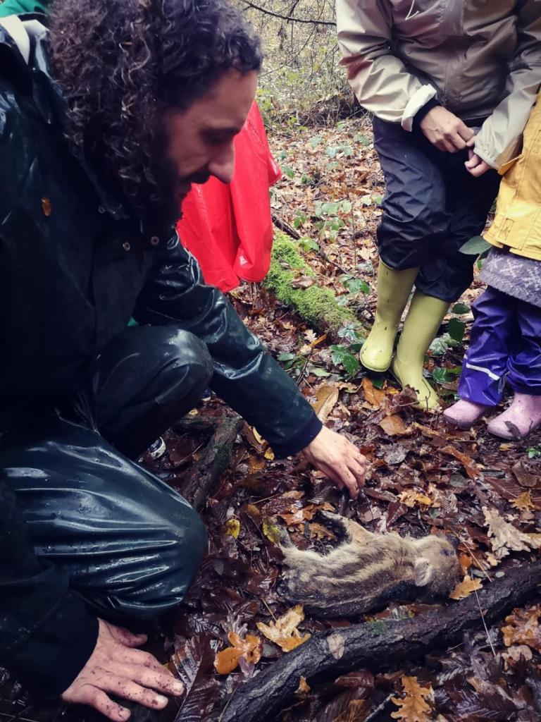Après l’avoir bien observé, et sentant quelques tristesses, j’ai proposé à chacun d’exprimer ce qu’il souhaitait pour le marcassin : le laisser à sa place, le mettre au creux d’un arbre et le recouvrir de feuilles, l’enterrer.