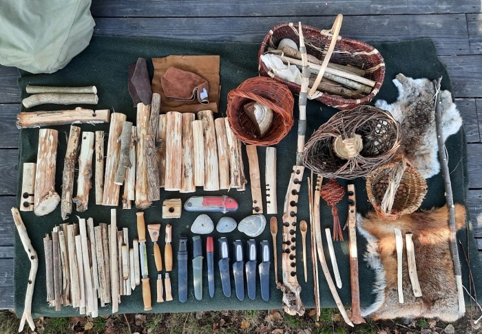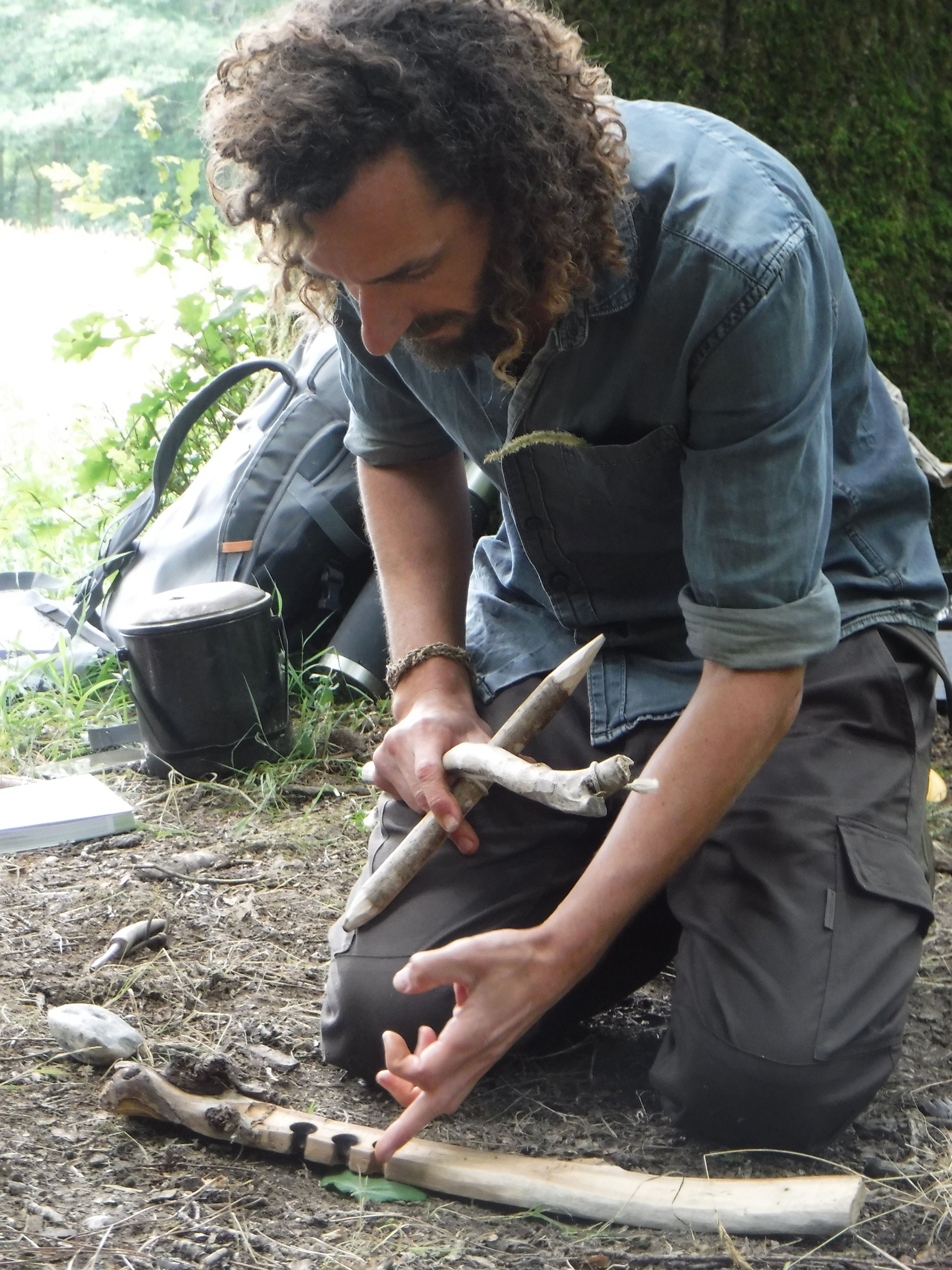 Autour d’un contenant qui favorise la connexion, vous aurez la chance de prélever le bois nécessaire à la taille de votre propre kit feu à l’archet : archer, drill, planchette et paumelle.